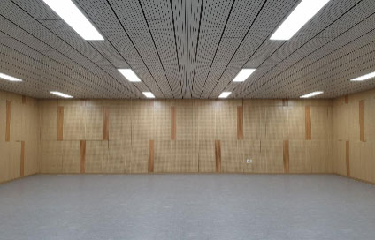 타공 흡음재로와 줄무늬 흡음재를 이용하여 이색지지 않으면 너무 산만하지 않은 심플하고 무난한 디자인으로 설계한 현장입니다.
